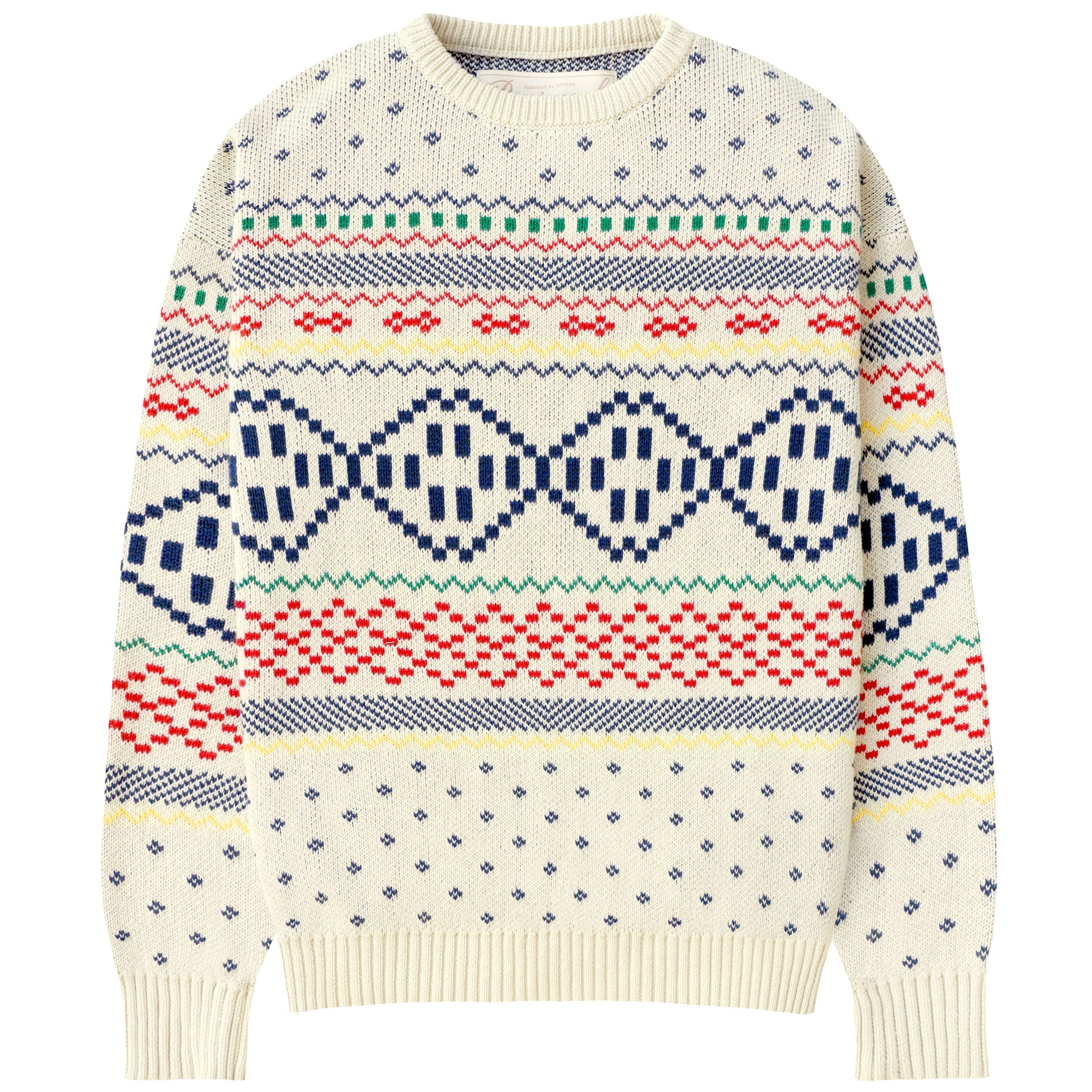 Our Fair Isle Sweater is a playful twist to a knitwear classic. Knit in Canada from 100% cotton — our design team went through dozens of pattern iterations and finally landed on the right amount of quirky meets modern. Think 80’s Ski Lodge but with wifi and a side of fondue.